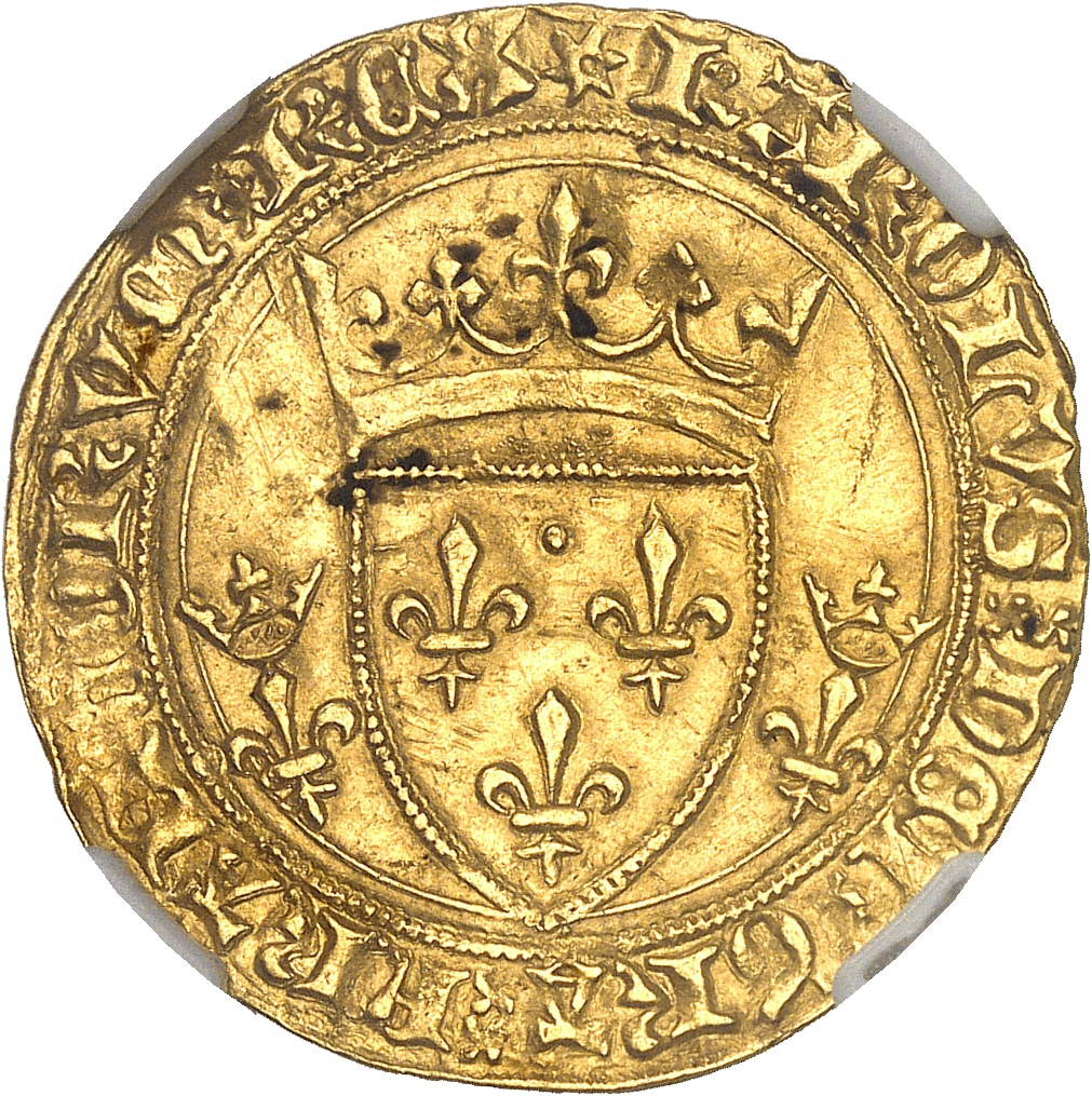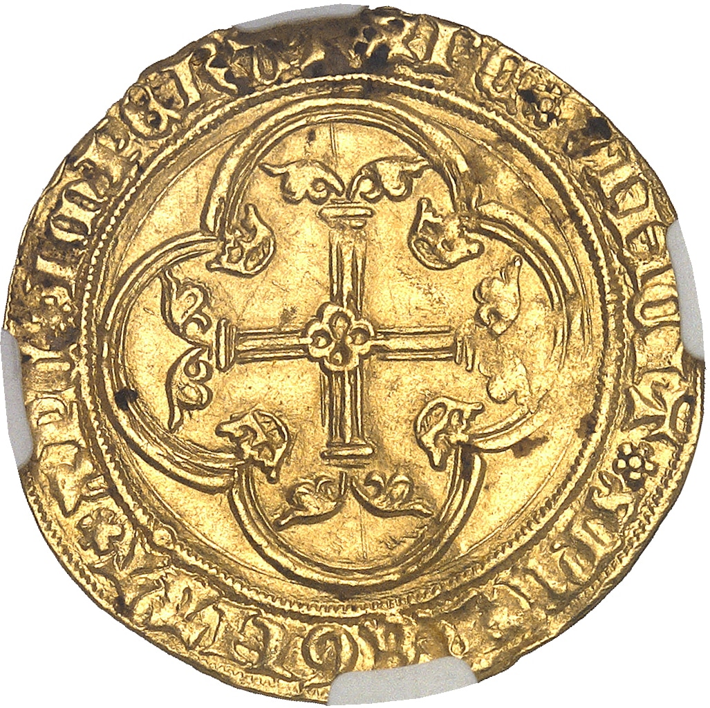 Nous reproduisons ci-dessous le commentaire de nos collègues de la Maison Palombo, vente 5, 7 juin 2008, n° 134 : “Philippe le Bon suite au traité d’Arras, et par obligation, donne bail de deux ans, à Pierre Fromont, Hacquinet de Mortaigne et Gobert, le 11 février 1437 pour frapper monnaies au nom de Charles VII, dans les ateliers d’Amiens et de Saint Quentin. Philippe le Bon imposa à ces ateliers de ne pas battre monnaies simultanément, afin que les tirages au nom de Charles VII soient les plus petits possibles. Il continua en revanche la fabrication de monnaies à son nom dans ses ateliers des Pays Bas. À l’expiration du bail, l’atelier d’Amiens fut confié à Georges de Caboistre jusqu’au 27 avril 1442, quant à celui de Saint Quentin, il cessa toute activité le 24 janvier 1439. Rarissime”