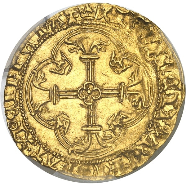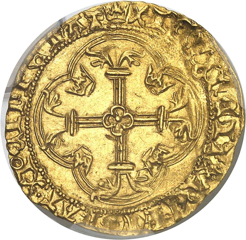 PCGS MS62 (51879288). Avec un point sous les couronnelles initiales : possiblement pour la rare 3e émission du 20 janvier (exécutoire du 19 mars) au 26 mai 1447. Les exemplaires avec point dans la couronne seraient de la 5e émission. Légèrement plié. Légère patine. TTB à Superbe.