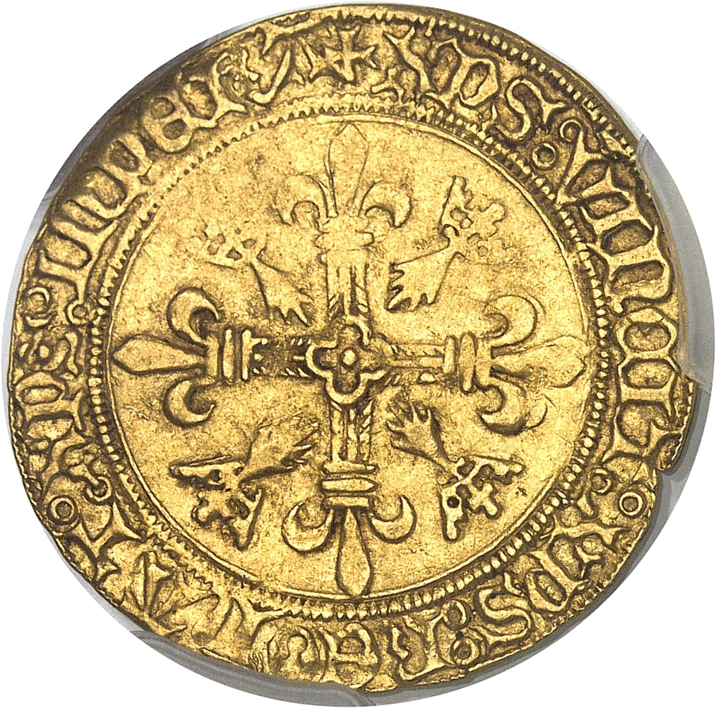 Rv. + XPS: VINCIT: XPS: REGNAT: XPS: INPERA. Croix fleurdelisée avec quadrilobe en cœur, cantonnée de quatre mouchetures d’hermine couronnées.