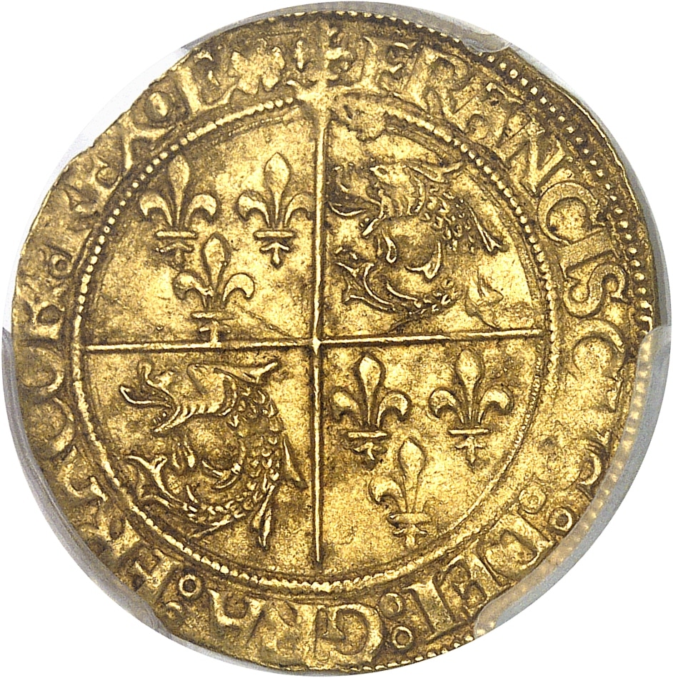 Av. + FRANCISCVS: DEI: GRA: FRACOR: REX. (différent) (atelier). Champ écartelé de France-Dauphiné ; en haut, un soleil.