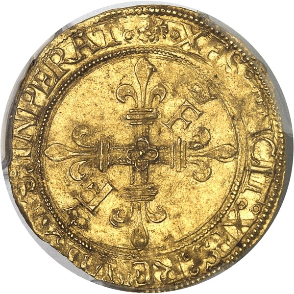 Rv. (atelier). XPS: VINCIT: XPS: RENAT: XPS: INPERAT. Croix fleurdelisée avec quadrilobe en cœur, cantonnée de deux F couronnées.