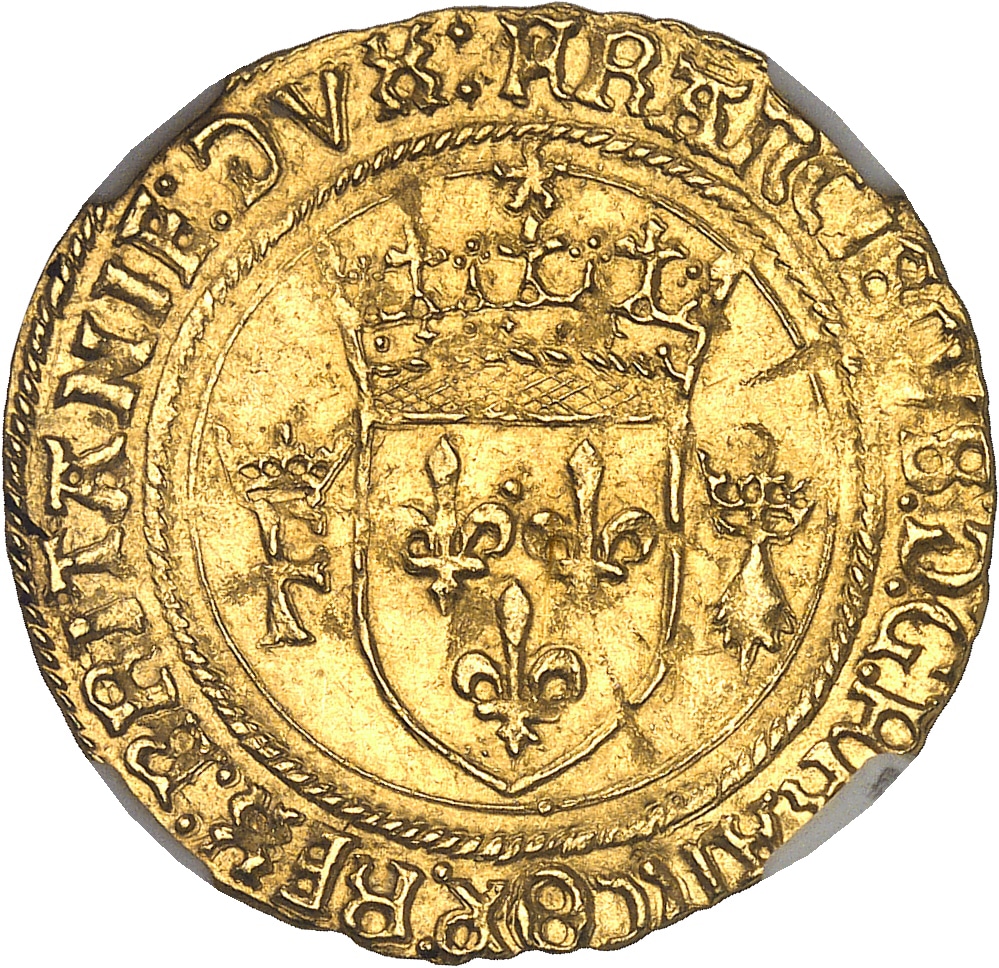 Av. FRANCISCVS: D: G: FRANCOR: REX: BRITANIE: DVX:. Écu de France couronné, accosté d’une F couronnée et d’une moucheture d’hermine couronnée, sous un soleil.