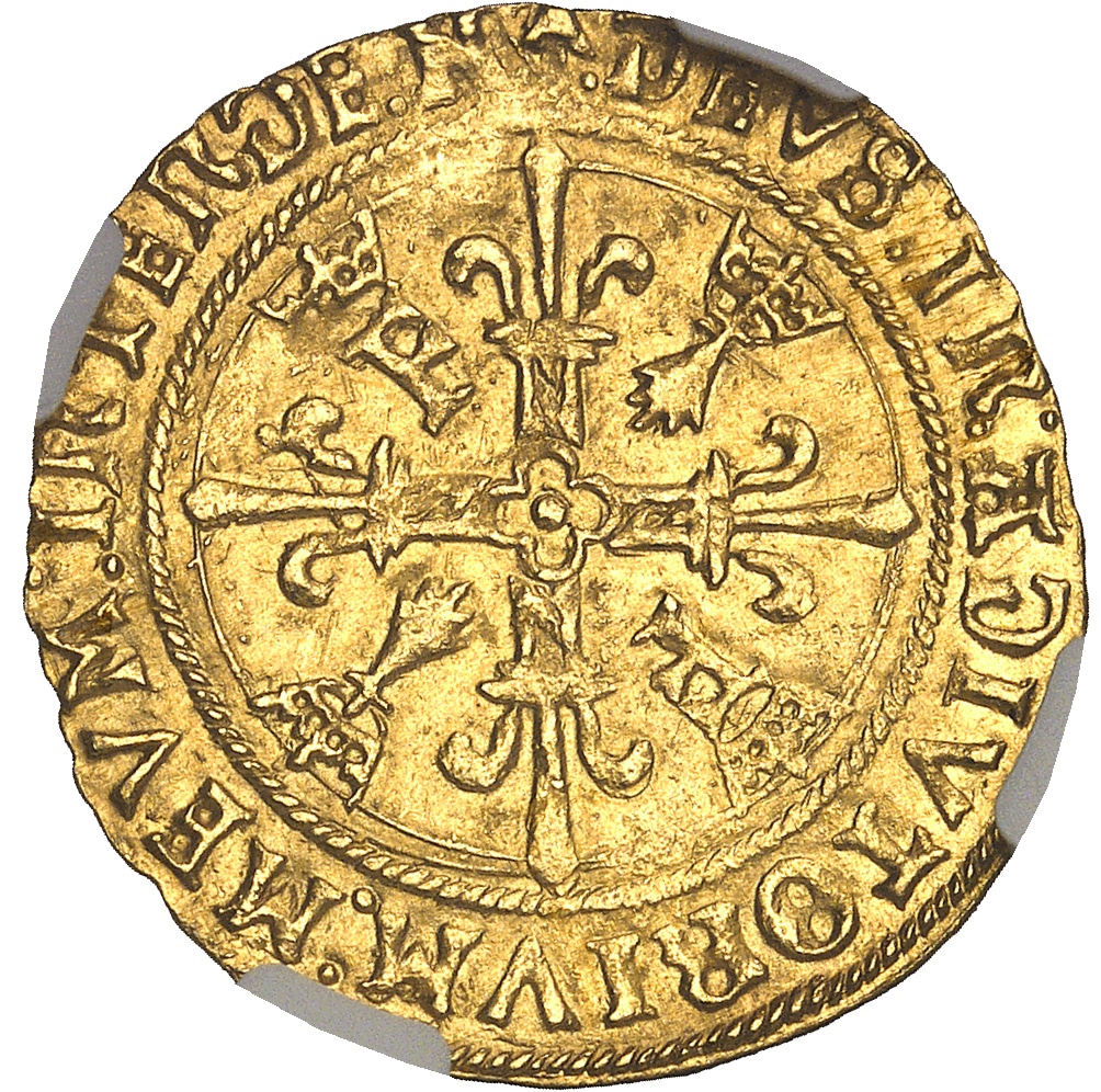 Rv. (différent) DEVS: IN: ADIVTORIVM: MEVM: INTENDE: (atelier). Croix fleurdelisée avec quadrilobe en cœur, cantonnée de deux mouchetures d’hermine couronnées et de deux F couronnées.