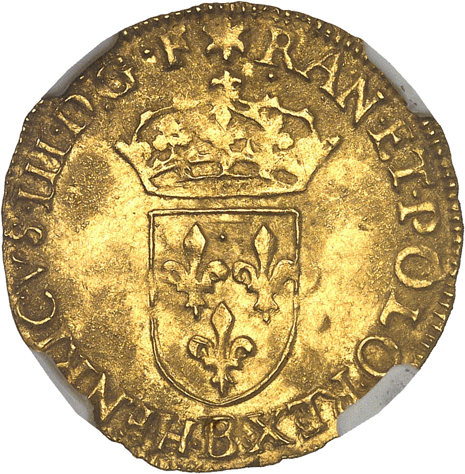 - FRANCE / ROYAL Henri III (1574-1589). Écu d’or au soleil 3e type 1581, B, Rouen.