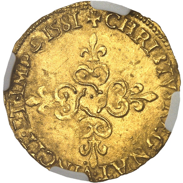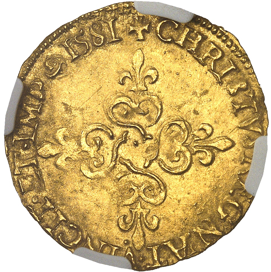 Rv. + CHRISTVS. REGNAT. VINCIT. ET. IMP (différent) (date). Croix anillée, fleurdelisée, avec quadrilobe en cœur.