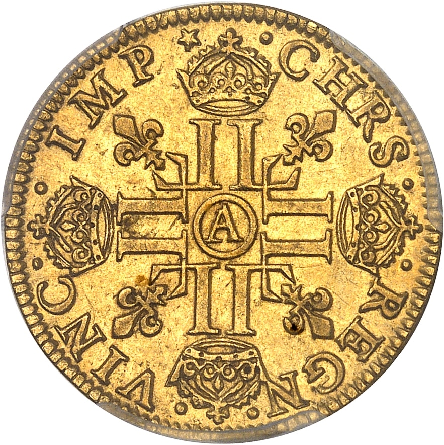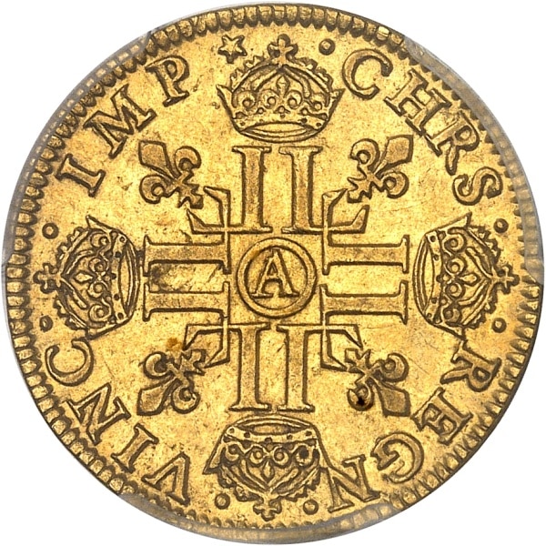 Rv. (à 12 h) .CHRS. - .REGN. - .VINC. - .IMP (étoile). Croix formée de huit L, chaque bras étant couronné, avec atelier en cœur, cantonné de quatre lis divergeant du centre.