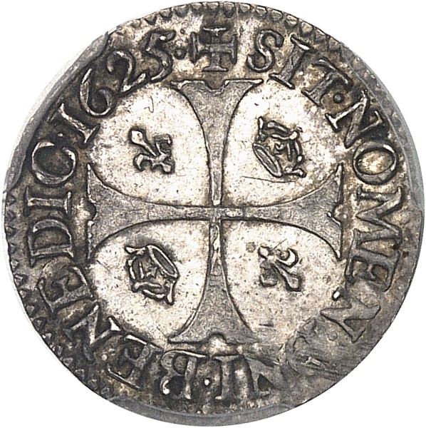Rv. + SIT. NOMEN. DNI. BENEDIC. (date). Croix échancrée, cantonnée de deux lis et de deux couronnelles.