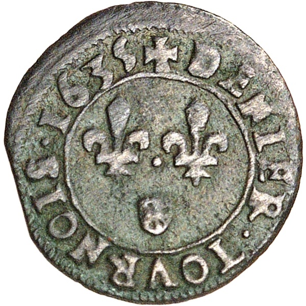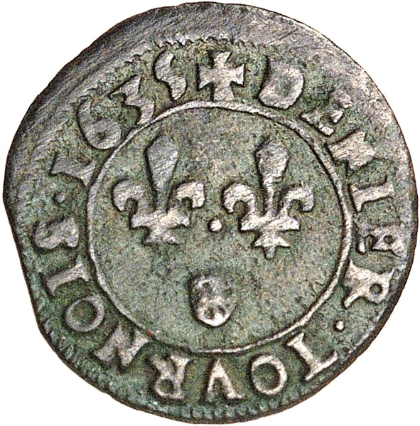 Rv. + DENIER. TOVRNOIS. (date). Deux lis et (atelier) posés deux et un.