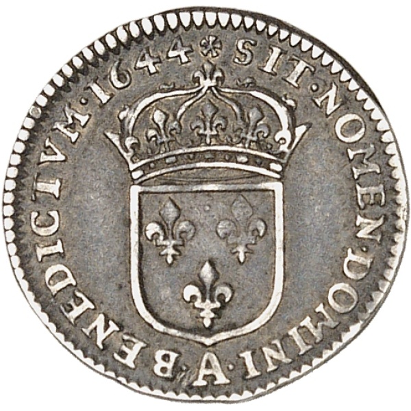 Selon Clairand (CGB 2023), ce type est un essai frappé par Isaac Briot et Jean Racle, à la Monnaie dite "de Matignon" (rose). On note qu’en 1644, Jean Warin obtint l'autorisation du Conseil du roi de frapper des vingt-quatrièmes et de quarante-huitièmes d'écu, d’un modèle légèrement différent et dits “au buste drapé” (Dy.1467-1468)