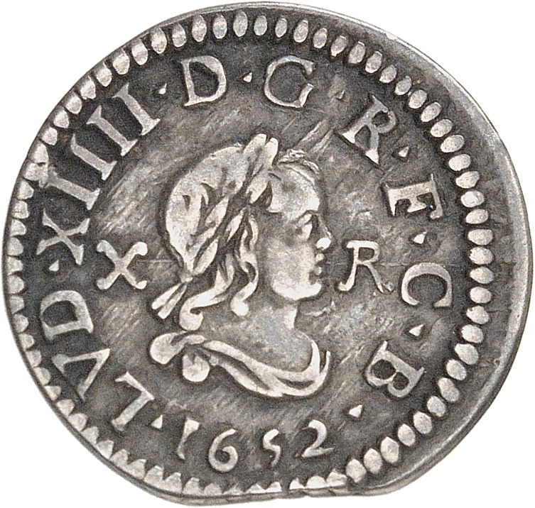 Av. LVD. XIIII. D. G. R. F. C. B. Buste à droite du Roi, lauré et drapé, accosté de X - R.