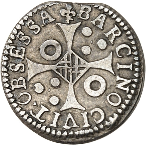 Rv. (lis) BARCINO CIVIT. OBSESSA. Écu losange de Barcelone brochant sur une croix, cantonnée aux 1 et 4 d'un annelet, aux 2 et 3 d'une groupe de trois besants.