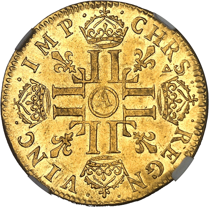 Rv. .CHRS. - .REGN. - .VINC. - .IMP. Croix formée de huit L adossées, chaque bras étant couronné, avec (atelier) dans un cercle en cœur, cantonnée de quatre lis divergeant du centre.