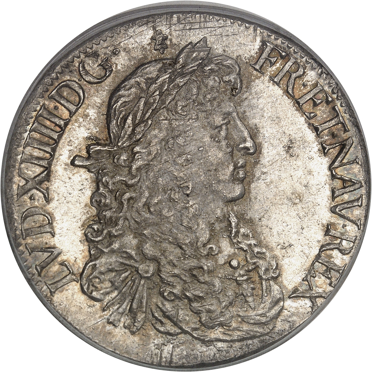 Av. LVD. XIIII. D. G. (différent) FR. ET. NAV. REX. Buste juvénile du Roi à droite, les cheveux longs, lauré, drapé et cuirassé à l’antique.