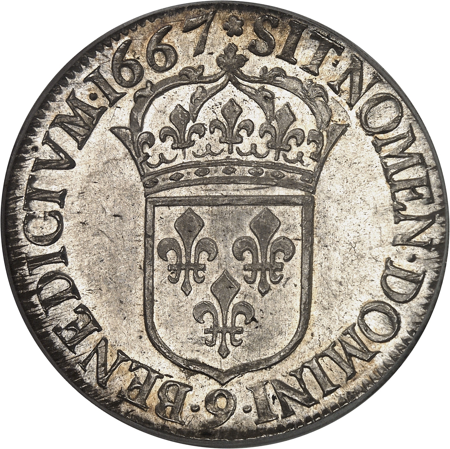 Rv. (différent) SIT. NOMEN. DOMINI. BENEDICTVM. (date). Écu de France couronné, au-dessous (atelier).