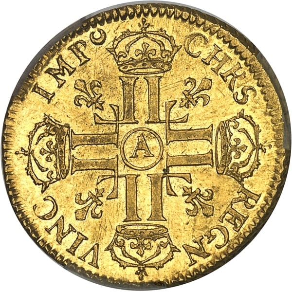 Rv. CHRS - REGN - VINC - IMP (différent). Croix formée de huit L adossées, chaque bras étant couronné, avec (atelier) dans un cercle en cœur, cantonnée de quatre lis divergeant du centre.