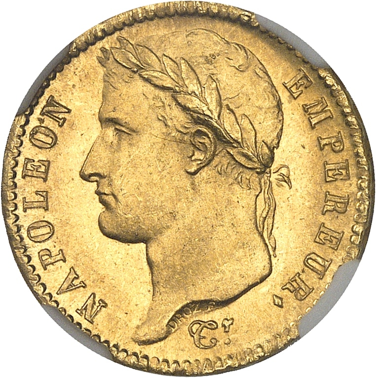 Rv. EMPIRE FRANÇAIS. Dans une couronne formée de deux branches : 20 FRANCS. ; au-dessous (différent) (date). (atelier).