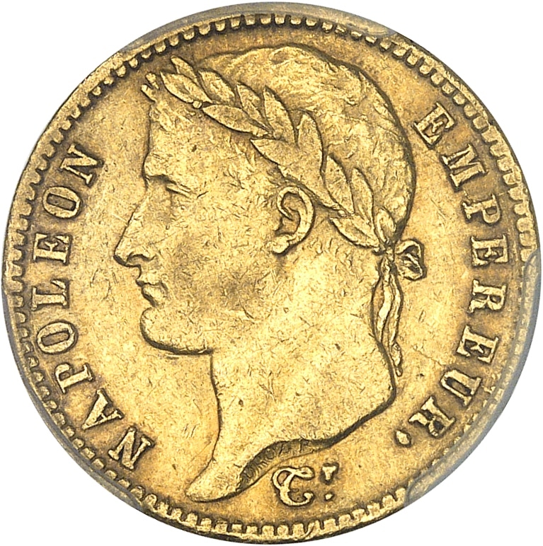 Rv. EMPIRE FRANÇAIS. Dans une couronne formée de deux branches : 20 FRANCS ; au-dessous (date) et (atelier).