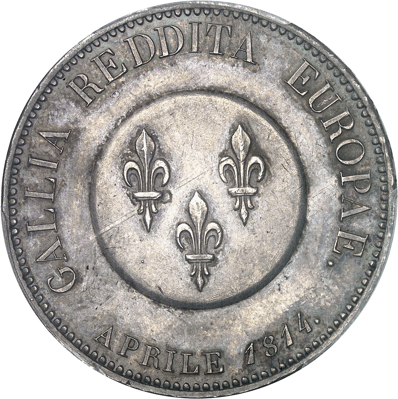 Av. GALLIA REDDITA EUROPAE. / APRILE 1814. Trois fleurs de lis dans un globe.