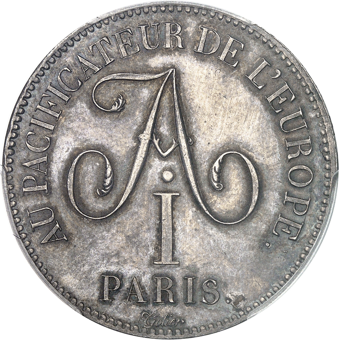 Rv. AU PACIFICATEUR DE L’EUROPE. Au centre, chiffre d’Alexandre Ier et au-dessous PARIS et signature Tiolier cursive.