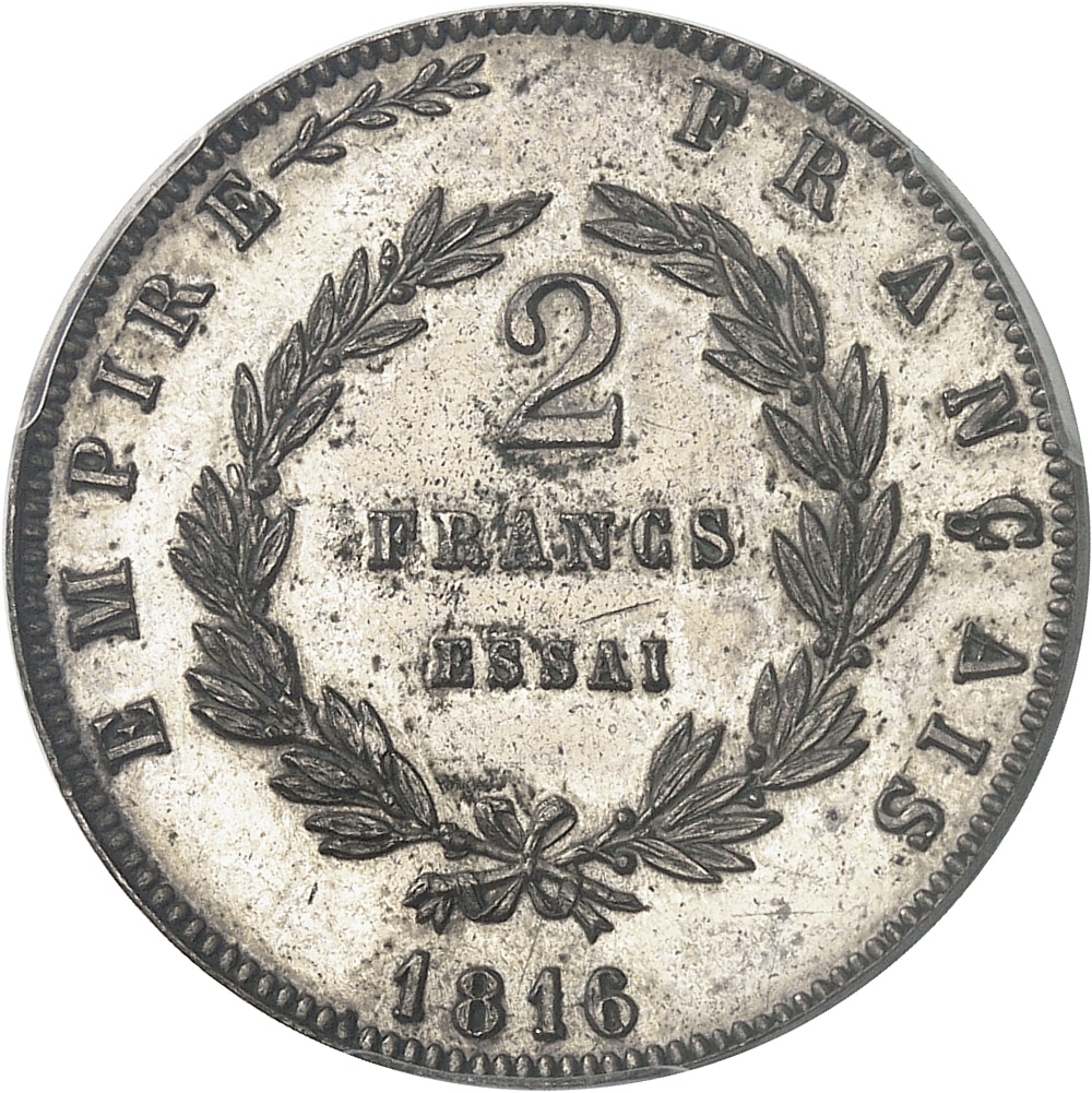 Rv. EMPIRE (branche) - FRANÇAIS. Dans une couronne formée de deux branches : 2 FRANCS ESSAI et au-dessous (date).
