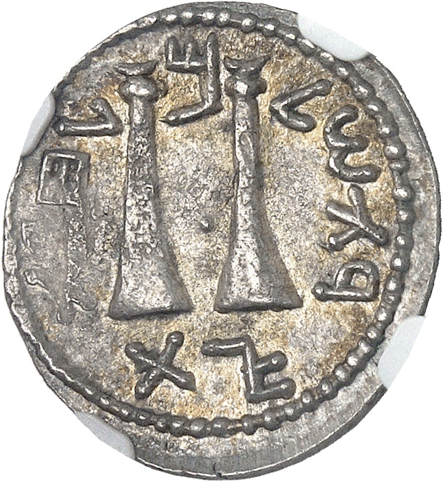 Rv. Légende hébraïque “Pour la liberté d’Israël”. Deux trompettes accolées, le tout dans un grènetis.