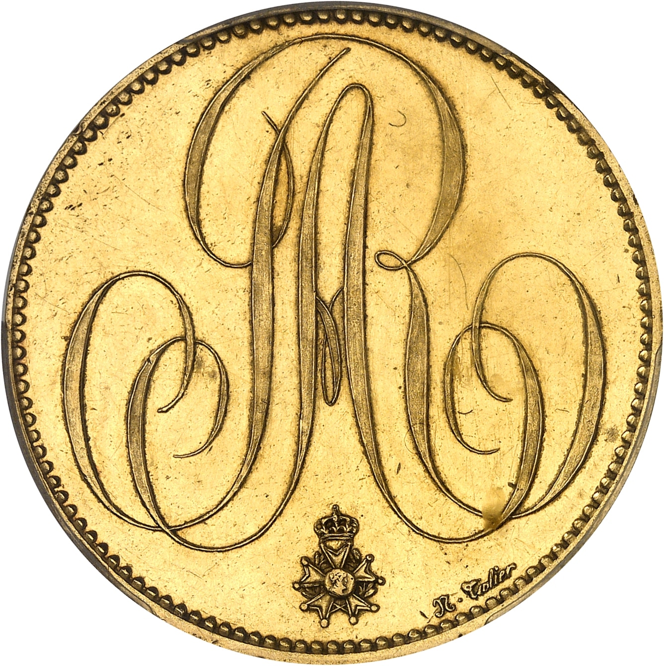 Ce type était connu en argent et en bronze : notre exemplaire montre qu’il fut aussi frappé en Or. Au moins un exemplaire en Or fut frappé pour le récipiendaire, le comte Antoine Roy, Ministre des finances (entre novembre 1819 et décembre 1821) et qui lui fut remis certainement lors de sa visite à la Monnaie de Paris en décembre 1820. Conservé en famille, par sa fille Alexandrine Roy (1799-1854), mariée avec Auguste Frédéric de Talhoüet (1788-1842), ce précieux exemplaire fut utilisé lors du mariage de leur fils Auguste de Talhoüet-Roy (1819-1884) avec Léonie Honnorez (1829-1892), célébré à Ris-Orangis le 2 août 1847 Découvrir cette pièce en vidéo