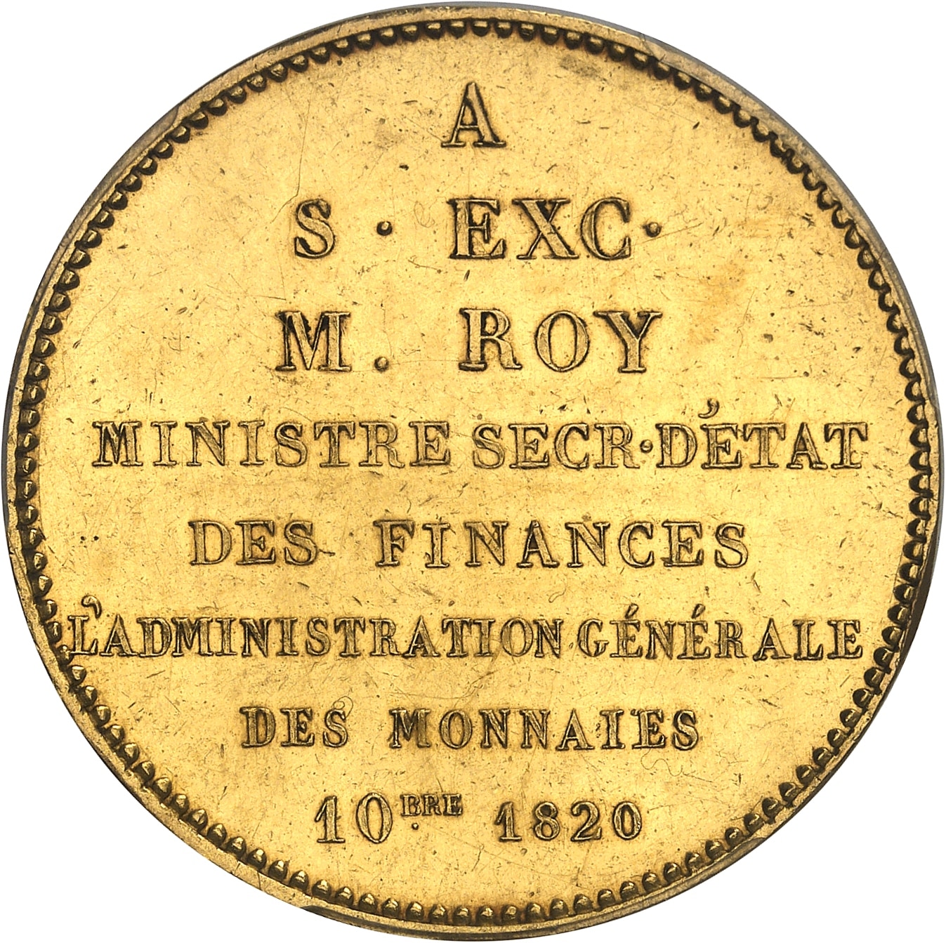 Rv. Dans le champ : A S. EXC. M. ROY MINISTRE SECR. D’ETAT DES FINANCES L’ADMINISTRATION GÉNÉRALE DES MONNAIES 10 BRE 1820.