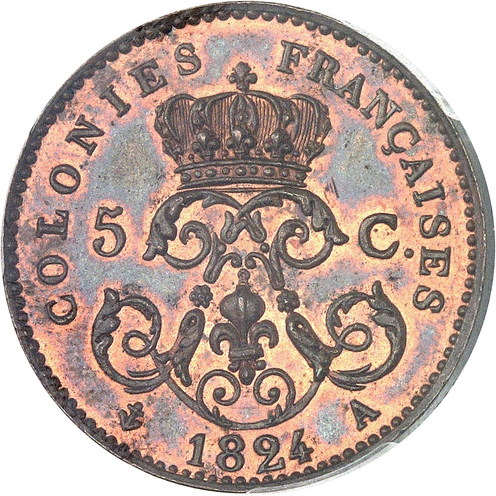 - Louis XVIII (1814-1824). Essai-piéfort de 5 centimes pour les colonies françaises, Frappe spéciale (SP) 1824, A, Paris.