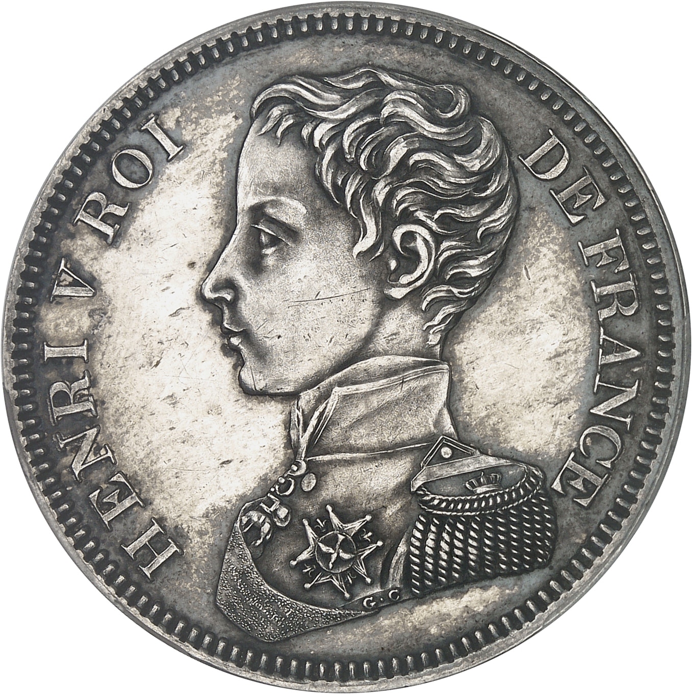 Av. HENRI V ROI DE FRANCE. Buste en uniforme à gauche d’Henri V, signature G. C.