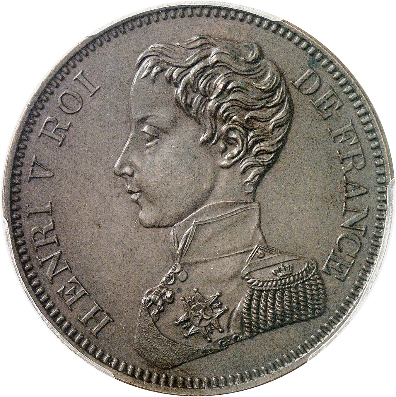 - Henri V (1820-1883). 5 francs en bronze, tranche lisse, Frappe spéciale (SP) 1831, Bruxelles (Würden).