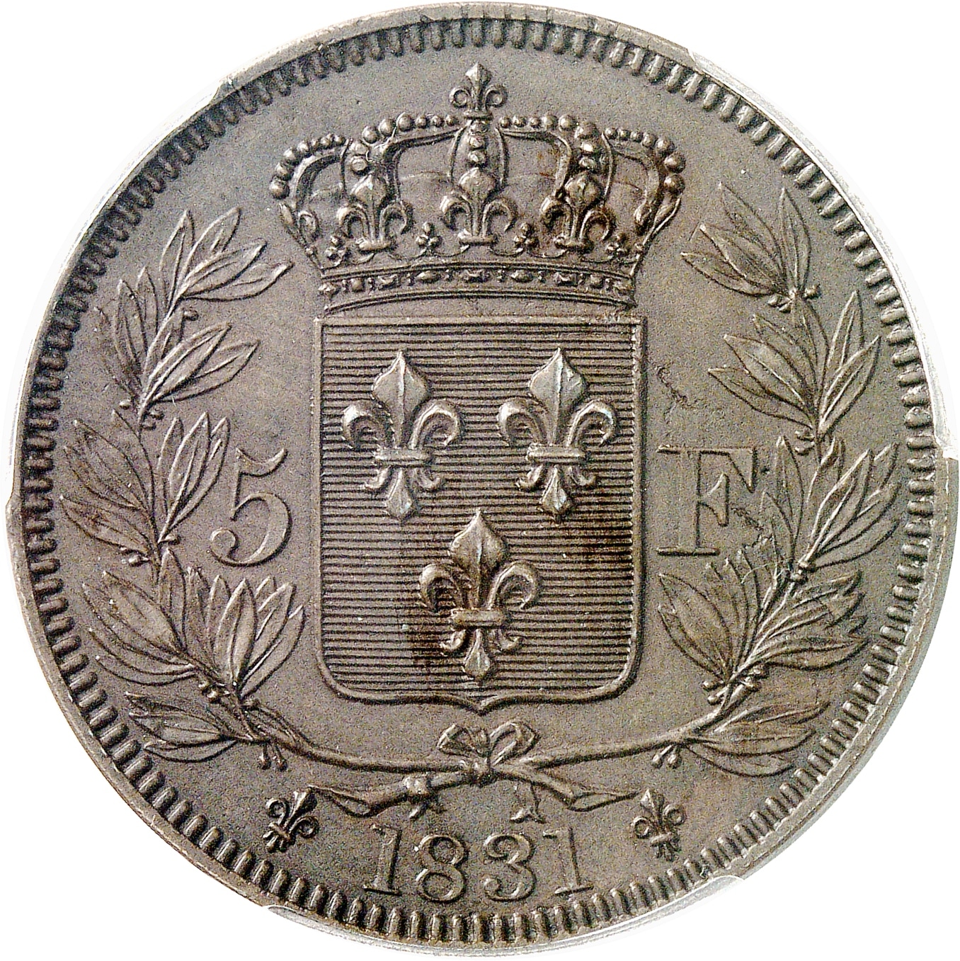 Rv. Dans une couronne formée de deux branches de laurier, écu de France accosté de 5 - F ; au-dessous (lis) (date) (lis).