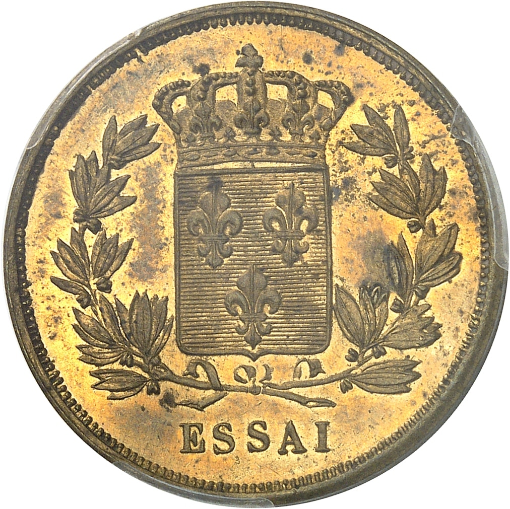 Rv. Dans une couronne formée de deux branches de laurier, écu de France ; au-dessous ESSAI.