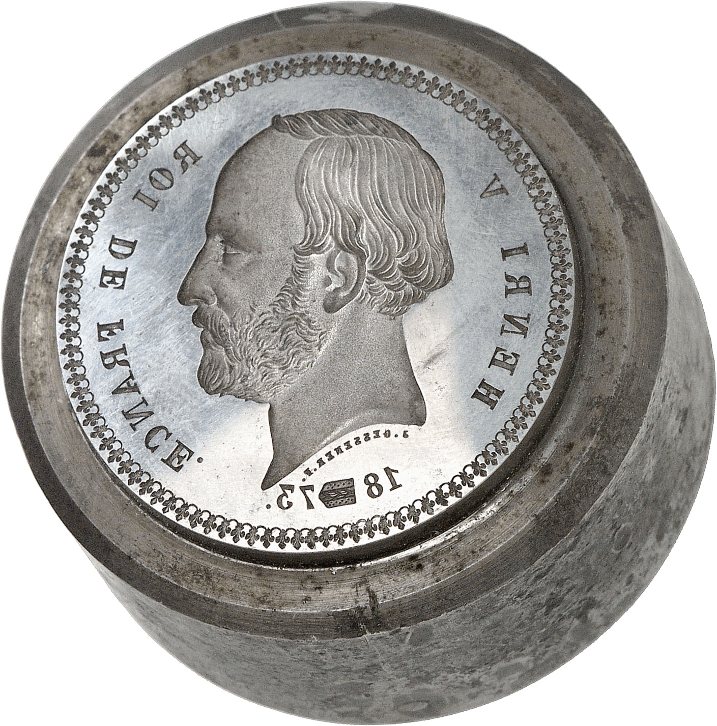 Av. HENRI V - ROI DE FRANCE. Tête barbue à droite, au-dessous signature J. GESSENER. F. et (date) coupée de l’écu de Neuchâtel.