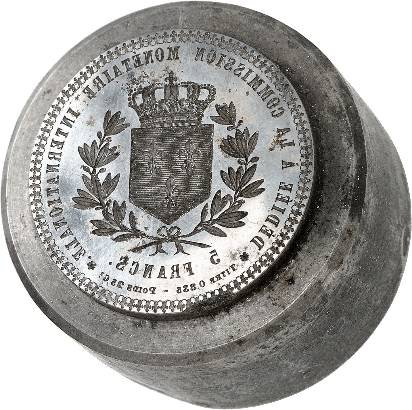 Rv. DÉDIÉE À LA COMMISSION MONÉTAIRE INTERNATIONALE. Dans une couronne formée de deux branches d’olivier, écu de France couronné ; au-dessous 5 FRANCS et plus bas TITRE 0,835 - POIDS 25 Gs.