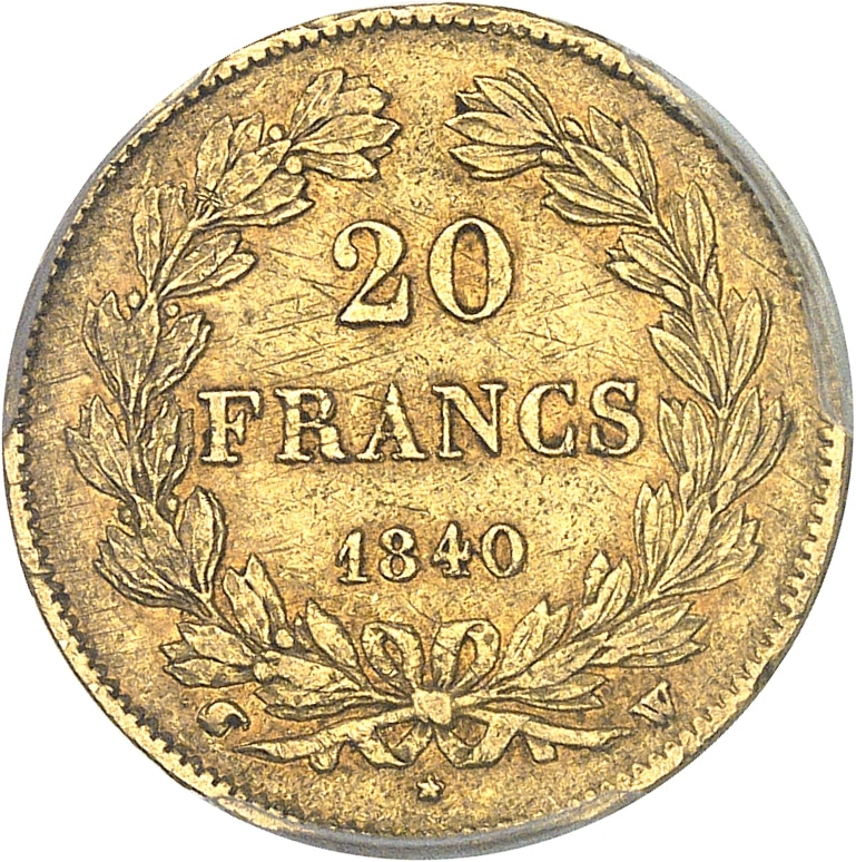 - Louis-Philippe Ier (1830-1848). 20 francs tête laurée (différent cornue de Charles Dierickx) 1840, W, Lille.