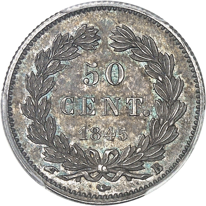 - Louis-Philippe Ier (1830-1848). Piéfort de 50 centimes tête laurée, Frappe spéciale (SP) 1845, B, Rouen.