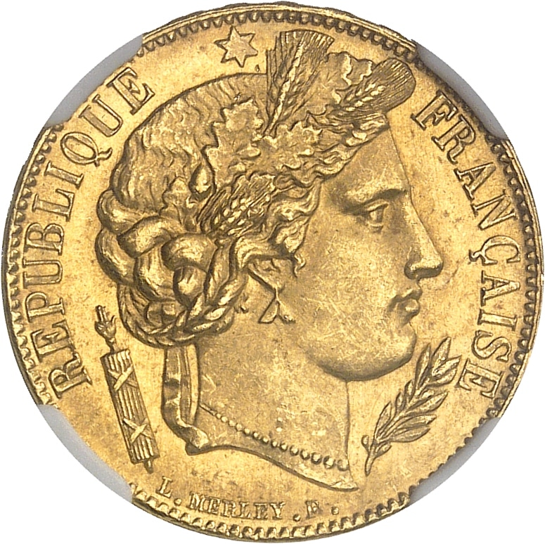 Av. RÉPUBLIQUE FRANÇAISE. Tête de la République à droite en Cérès, sous une étoile, entre un faisceau et une branche ; au-dessous signature L. MERLEY. F.