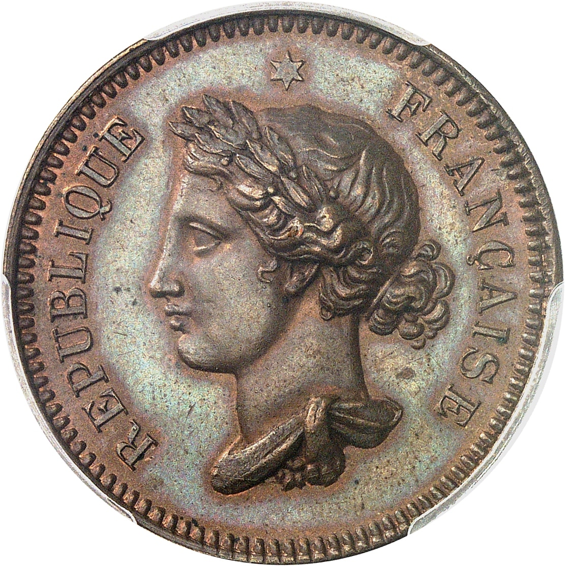 - IIe République (1848-1852). Essai de 10 centimes, concours de 1848, troisième type par Gayrard, Frappe spéciale (SP) 1848, Paris.