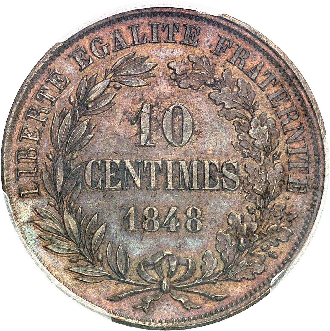 Rv. LIBERTÉ ÉGALITÉ FRATERNITÉ. Dans une couronne formée d’une branche de laurier et d’une branche de chêne : 10 CENTIMES (date).