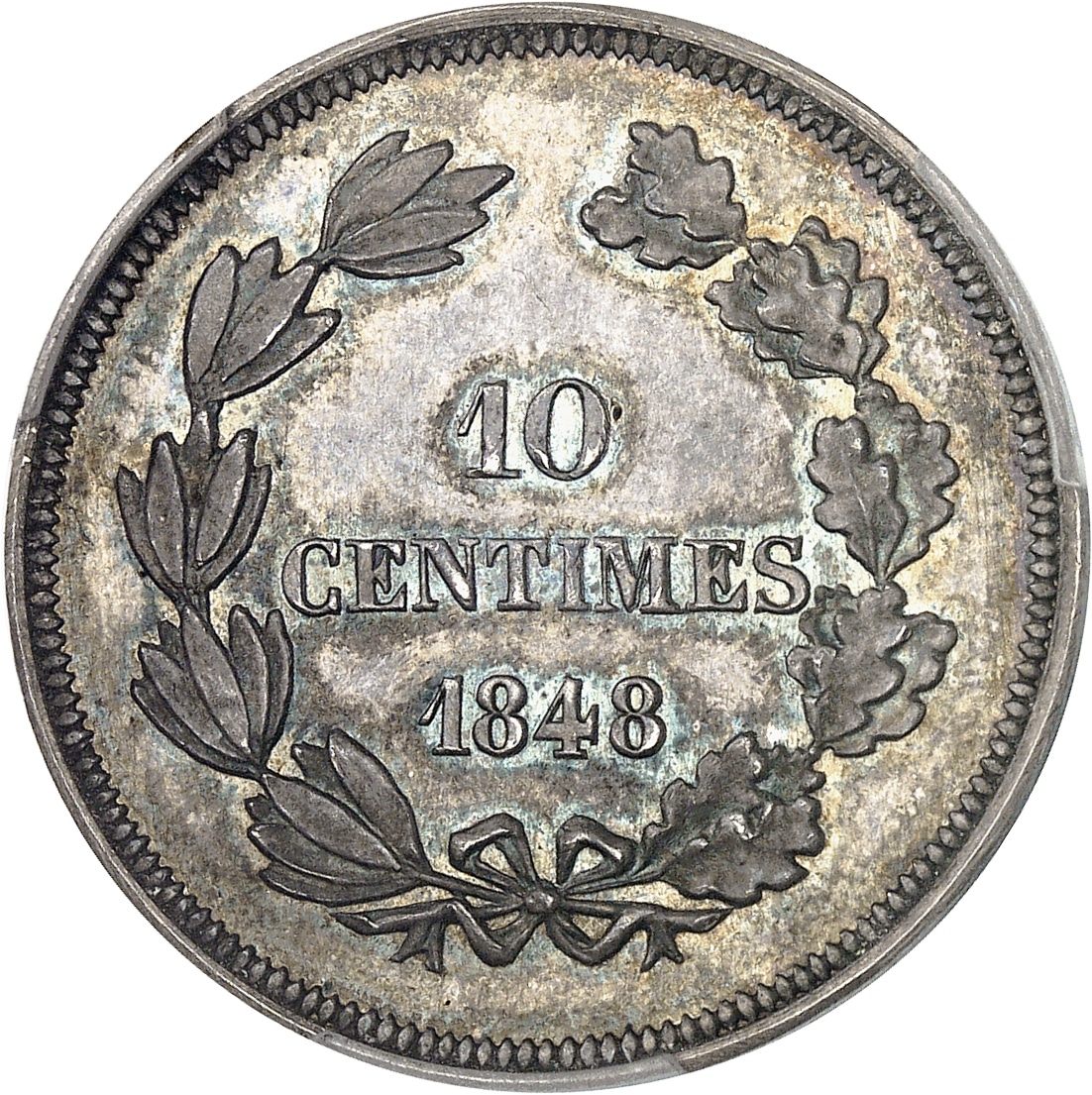- IIe République (1848-1852). Essai de 10 centimes, concours de 1848, par Moullé, Frappe spéciale (SP) 1848, Paris.