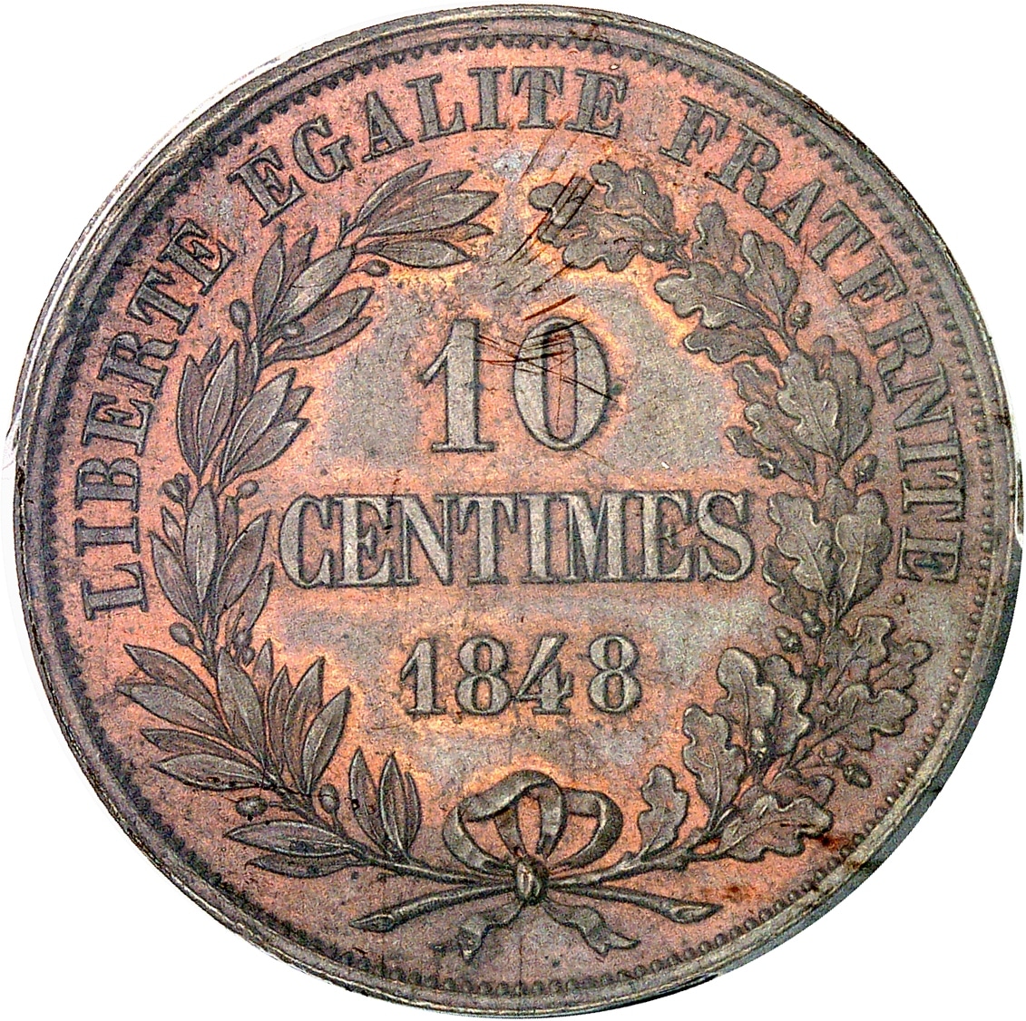 Rv. LIBERTÉ ÉGALITÉ FRATERNITÉ. Dans une couronne formée d’une branche de laurier et d’une branche de chêne : 10 CENTIMES (date).
