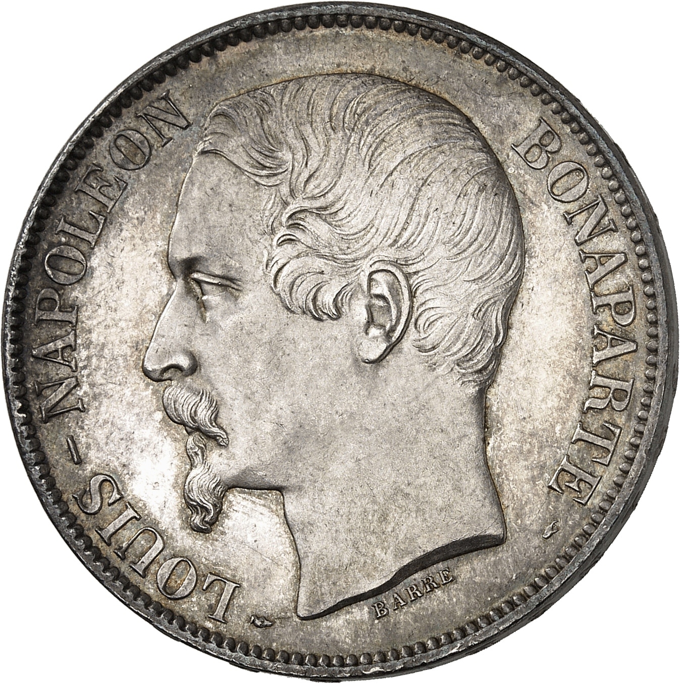 Av. (différent) LOUIS-NAPOLEON BONAPARTE (différent). Tête nue à gauche ; au-dessous signature BARRE.