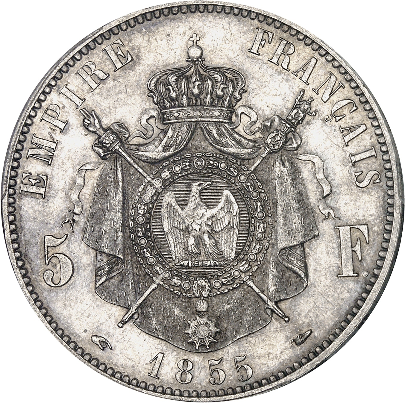 Rv. EMPIRE FRANÇAIS. Armes impériales posées sur un manteau couronné et brochant sur le sceptre et la main de justice, accostées de 5 - F ; au-dessous (différent) (date) (différent).