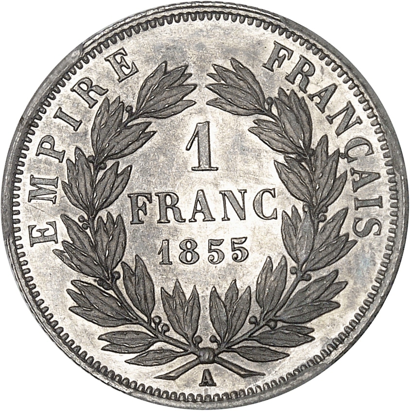 Rv. EMPIRE FRANÇAIS (date). Dans une couronne formée de deux branches d’olivier : 1 FRANC (date) ; à l’exergue (atelier).