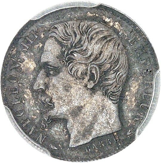 Av. (différent) NAPOLEON III EMPEREUR (différent). Tête nue à gauche, au-dessous signature BARRE.