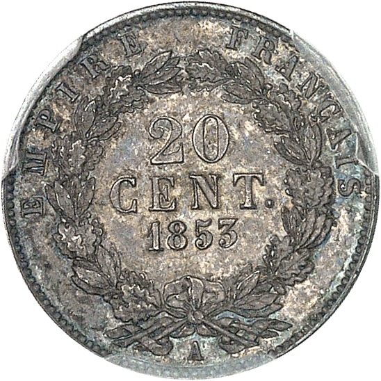 - Second Empire / Napoléon III (1852-1870). 20 centimes tête nue, grosse tête, Frappe spéciale (SP) 1853, A, Paris.