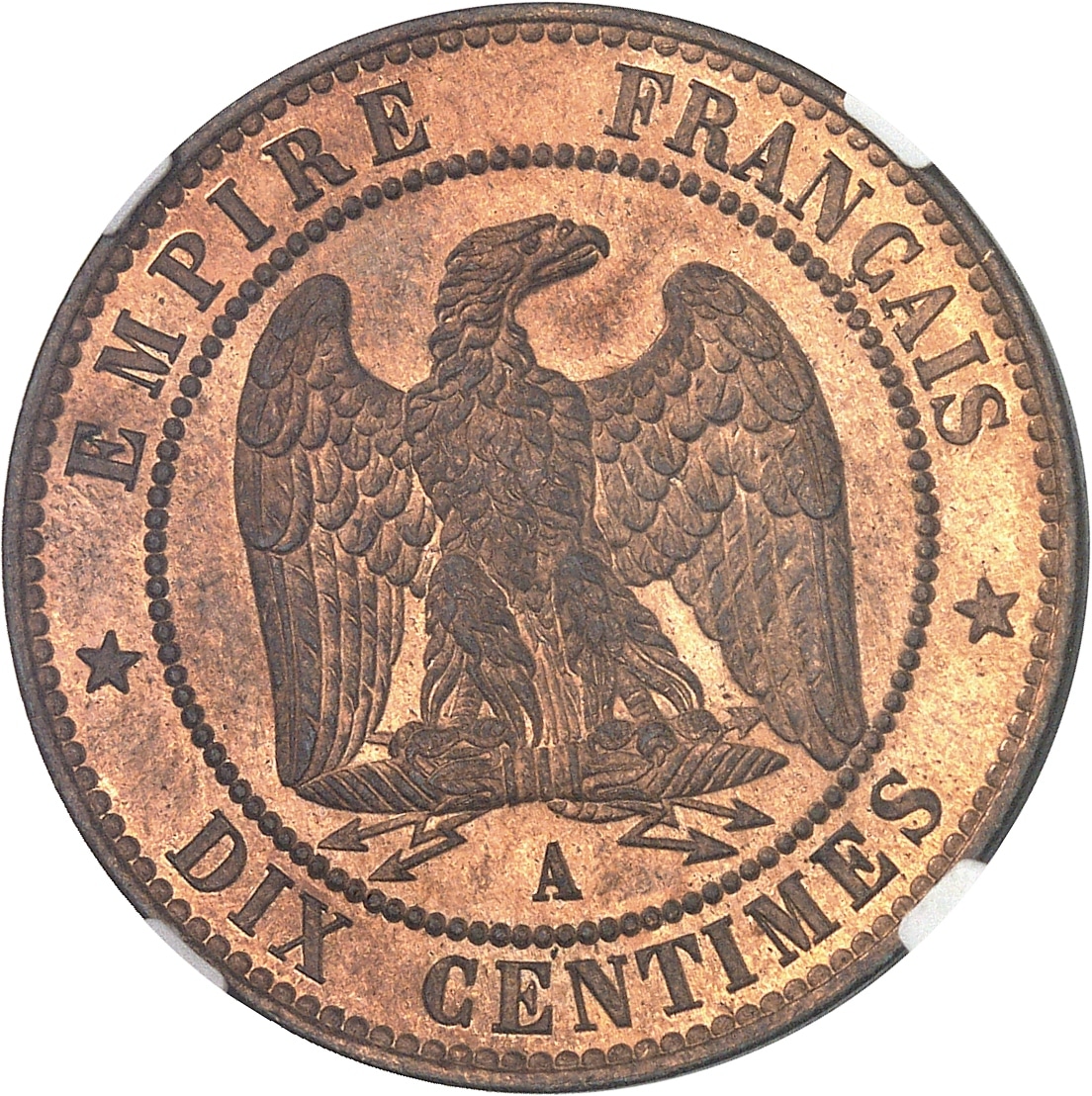 Rv. EMPIRE FRANÇAIS / * DIX CENTIMES *. Aigle éployée, la tête à droite, sur un foudre ; au-dessous (atelier).