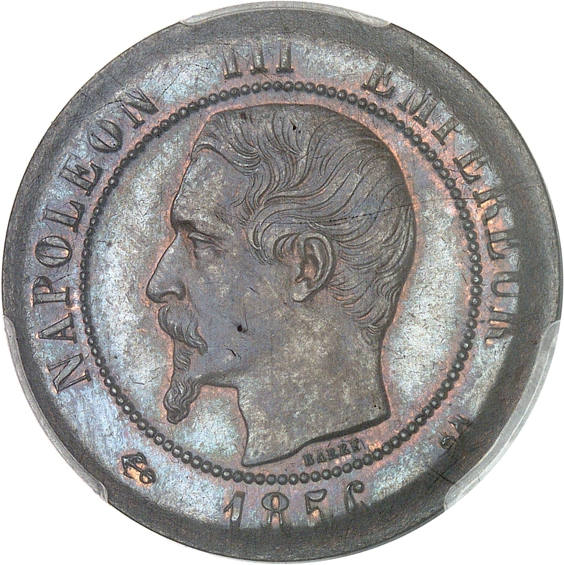 - Second Empire / Napoléon III (1852-1870). Cinq centimes tête nue, erreur de frappe sur flan de dix centimes (mule w/ 10C obv die) 1856, B, Rouen.