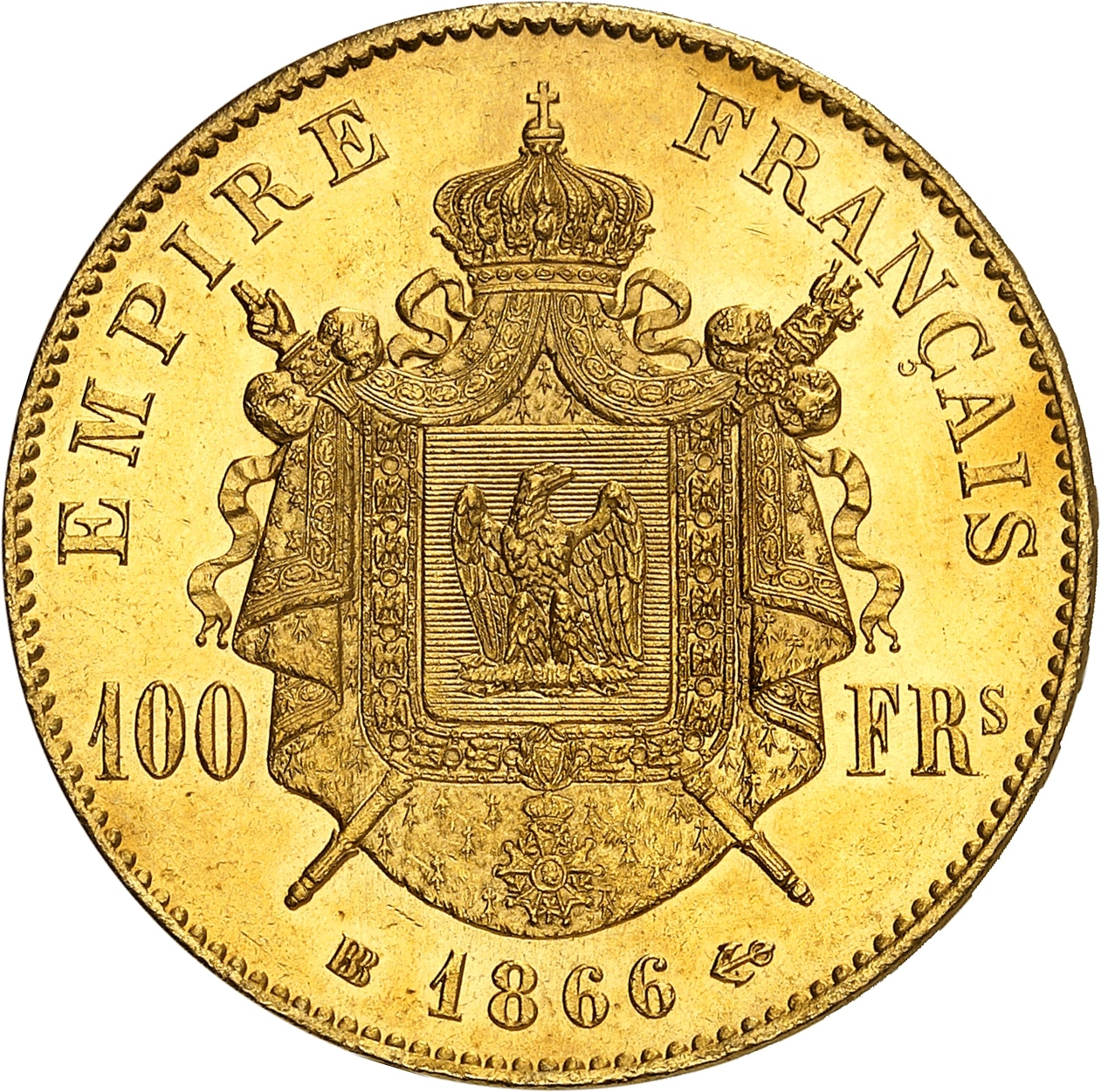 Rv. EMPIRE FRANÇAIS. Armes impériales posées sur un manteau couronné et brochant sur le sceptre et la main de justice, accostées de 100 - FRs ; au-dessous (atelier) (date) (différent).