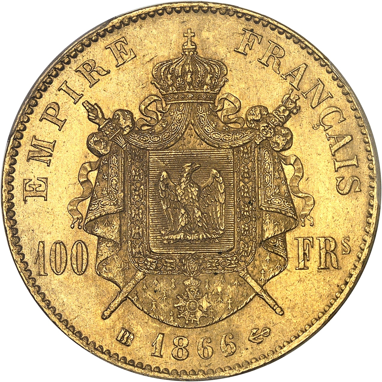 Rv. EMPIRE FRANÇAIS. Armes impériales posées sur un manteau couronné et brochant sur le sceptre et la main de justice, accostées de 100 - FRs ; au-dessous (atelier) (date) (différent).